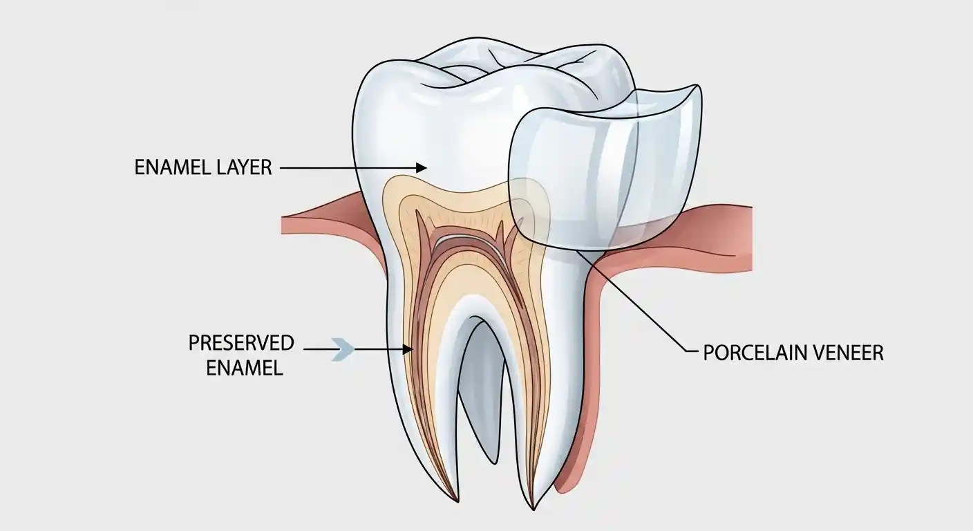 A veneer is a thin shell, typically made of porcelain or composite resin, bonded to the front surface of a tooth. To ensure it fits naturally and doesn’t look bulky, a small amount of enamel is usually removed beforehand.